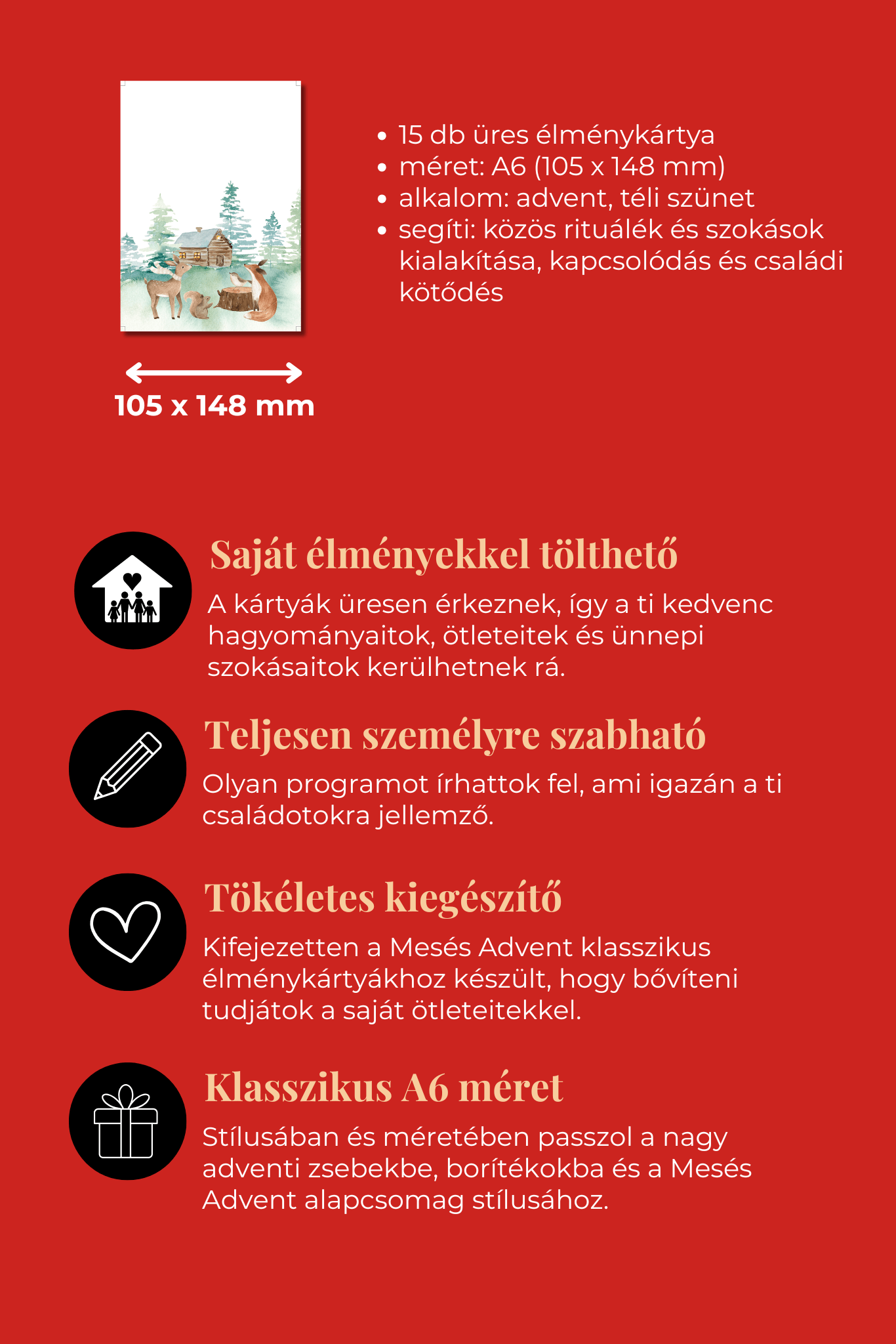 Míg a Mesés Advent élménykártyák kész, előre megírt programötleteket adnak, ezek a kártyák szabadon alakíthatók, így a kalendárium teljesen egyedi, személyre szabott, család-specifikus élménynaptárrá válik. Ide kerülhetnek a saját „mini szertartásaitok”, kedvenc adventi esti játékaitok, vagy akár olyan hagyományok, amelyeket most szeretnétek megteremteni.