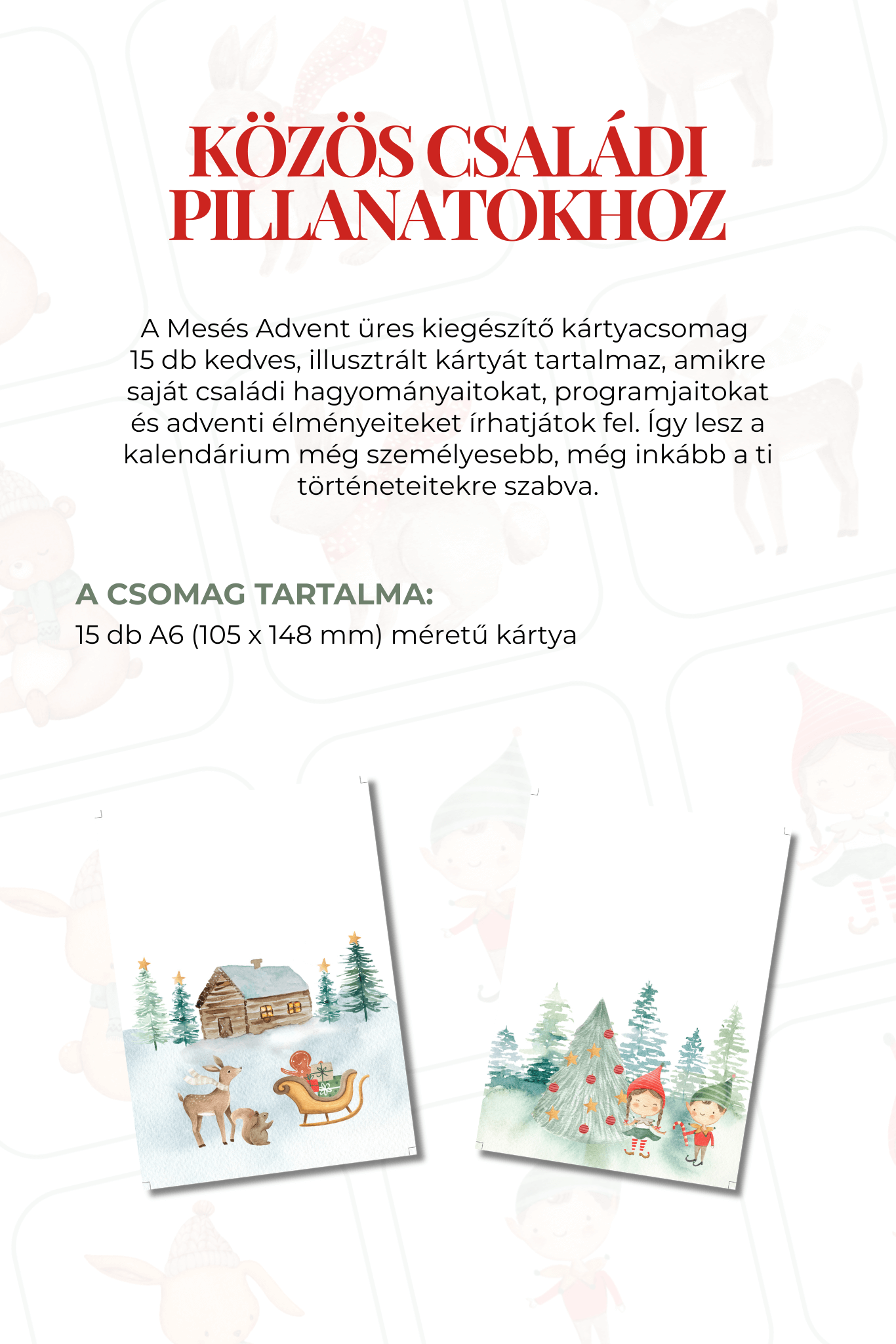 Ha az advent számotokra nem a rohanásról és a feladatlistákról szól, hanem a közös pillanatokról, a meghitt szokásokról és az együtt megélt élményekről, akkor az Üres kiegészítő élménykártyacsomagot imádni fogjátok. A 15 db, illusztrált kártya mind arra vár, hogy ti magatok töltsétek meg tartalommal – olyan hagyományokkal, apró meglepetésekkel és kedvenc családi programokkal, amelyek valóban Rólatok szólnak.