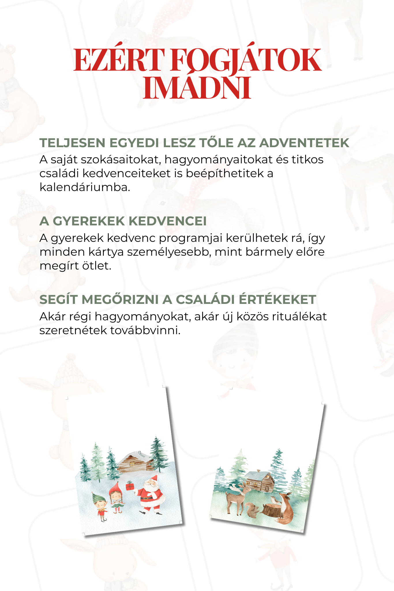 Azoknak a családoknak, akik szeretnék, ha az advent valódi történetekről, egymásra figyelésről és közös élményekről szólna. Különösen ajánlott azoknak, akik a Mesés Advent klasszikus élménykártyákat már használják, és most személyes tartalmakkal egészítenék ki.